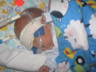 Nicholas had a wonderful day today. He was taken off the oscillator and moved to the conventional ventilator this morning. His blood gases have been good and he has been stable on it all day. He is still off the dopamine and his blood pressure is good. It doesn't need to be checked every hour anymore since it isn't low so he doesn't have to constantly wear the blood pressure cuff. I'm sure he is happy that is finally off of him. He continues to have good urine output and no residuals from his feeds. They are planning on weaning him off of the hydrocortizone next and might increase his milk by a tiny bit tomorrow. He looked so comfy with the flexible ventilator tubes and all bundled up in his snugly. I hope we never see the oscillator again!